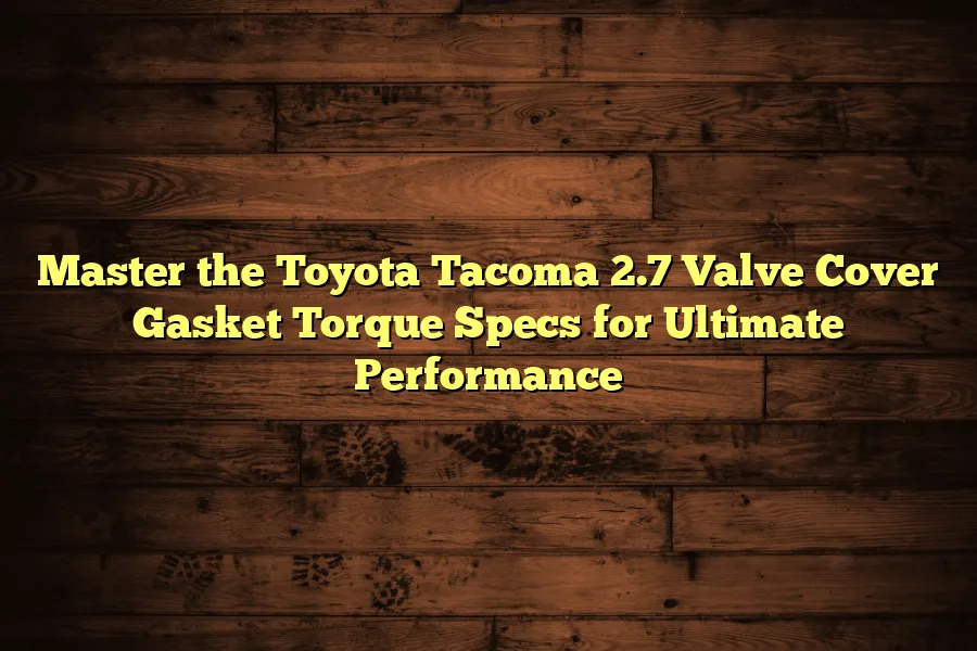 The torque specs for the valve cover gasket on a Toyota Tacoma 2.7 are 40 inch-pounds for the 6mm fasteners and 53 inch-pounds for the …